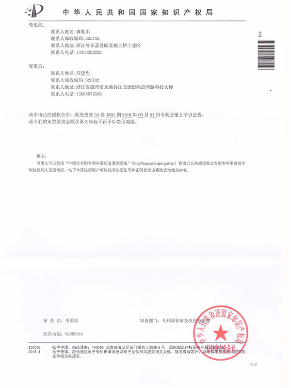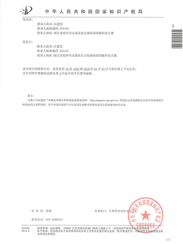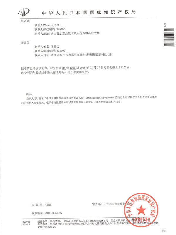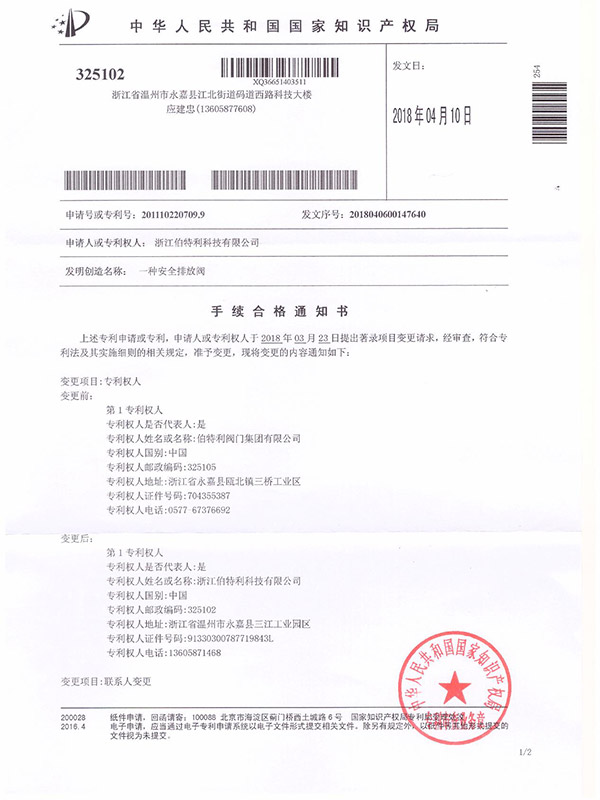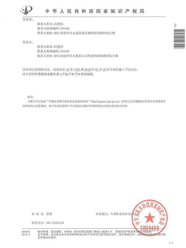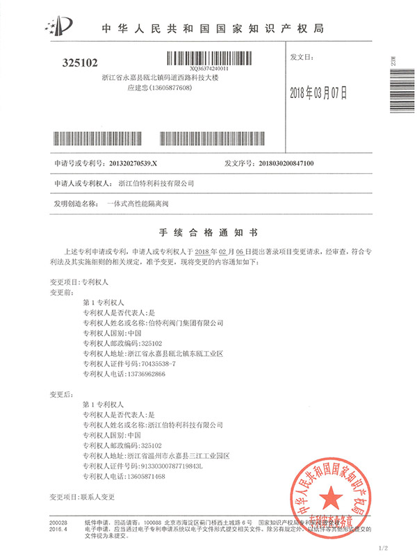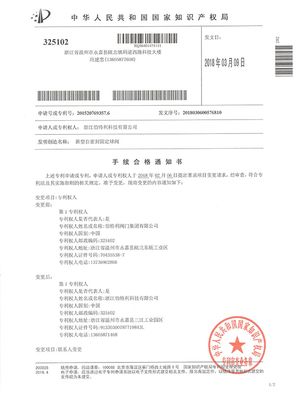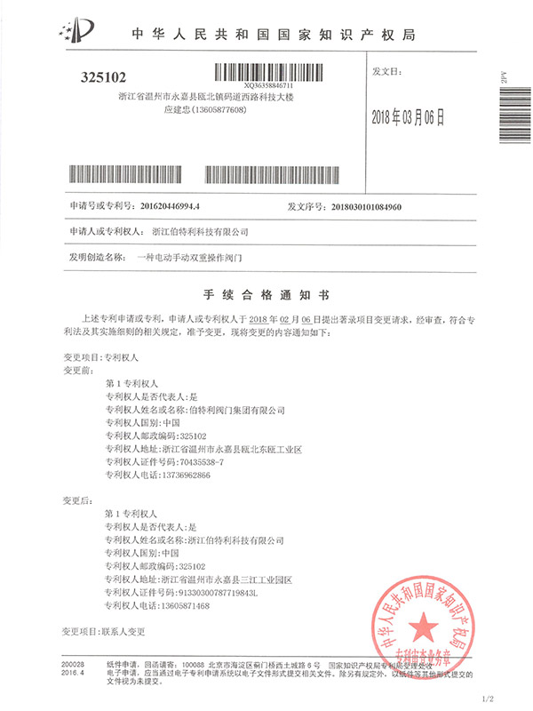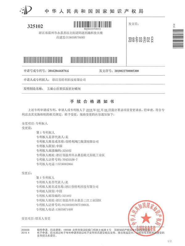 patent certificate-Five eccentric oblique arc sealing butterfly valve (2)