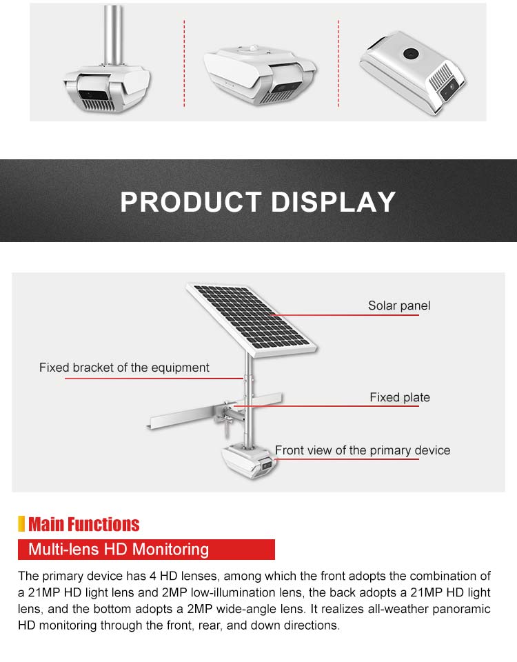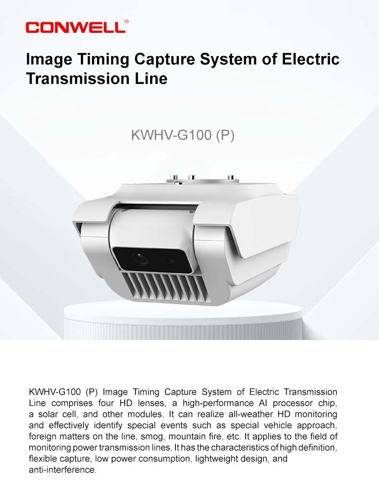 KWHV-G100 (P) Image Timing Capture System of Electric Transmission Line comprises four HD lenses, a high-performance AI processor chip, a solar cell, and other modules. It can realize all-weather HD monitoring and effectively identify special events such as special vehicle approach, foreign matters on the line, smog, mountain fire, etc.