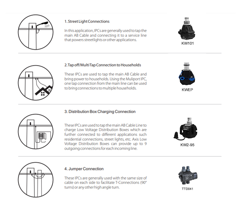 Insulation Piercing Connector is used for all AB cable systems (messenger wire and self-supporting systems) that accept a tap connection. This connection further distributes a line in street lighting and domestic utility connections. The design makes it possible to entirely seal the connection against water penetration, making it a waterproof connector.