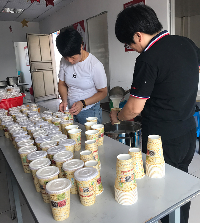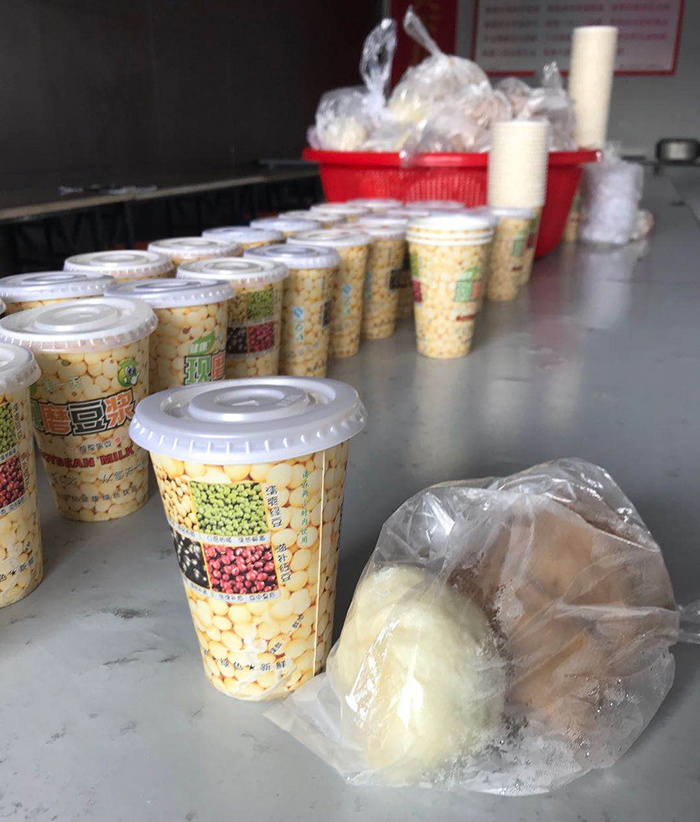 Auntie in the canteen prepare sweet soy milk and delicious buns in the early morning.