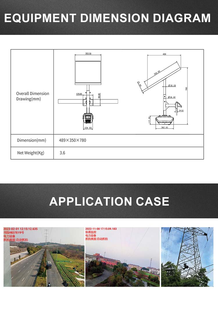 KWHV-G100 (P) Image Timing Capture System of Electric Transmission Line comprises four HD lenses, a high-performance AI processor chip, a solar cell, and other modules. It can realize all-weather HD monitoring and effectively identify special events such as special vehicle approach, foreign matters on the line, smog, mountain fire, etc.